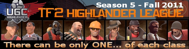 Our Season 5 of TF2 Highlander begins on Sept. 14 and runs to Playoff Final Matches on Dec 12, 2011. If you haven't played highlander before, each team has 9 players and there can be only ONE of each class!
